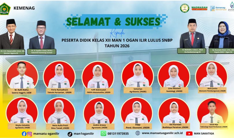 Kabar membanggakan kembali datang dari dunia pendidikan madrasah di Bumi Caram Seguguk. Sebanyak 12 siswa-siswi terbaik Madrasah Aliyah Negeri (MAN) 1 Ogan Ilir dinyatakan lulus dan diterima di Perguruan Tinggi Negeri (PTN) impian melalui jalur Seleksi Nasional Berdasarkan Prestasi (SNBP) tahun 2026.