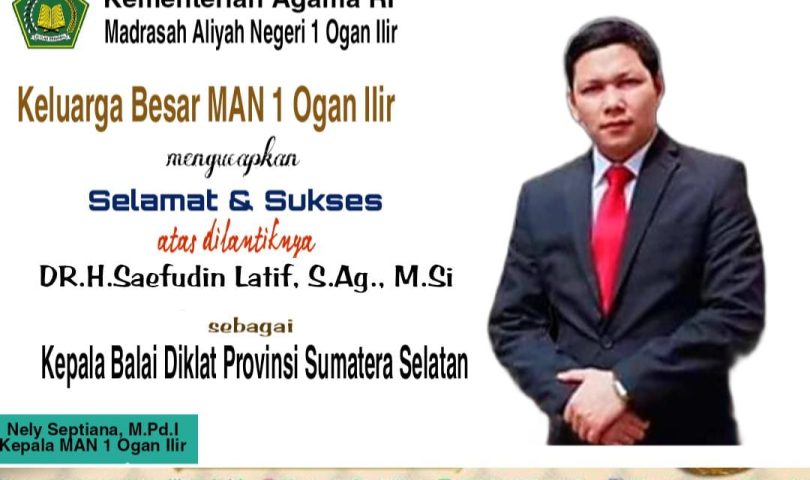 Sekjen Kemenag Republik Indonesia secara resmi telah melantik Saefudin Latif sebagai Kepala Balai Diklat Keagamaan Palembang pada Kamis (16/6) di Jakarta. Keluarga besar Madrasah Aliyah Negeri 1 Ogan Ilir menyampaikan ucapan selamat atas dilantiknya Saefudin Latif yang mengemban amanah sebagai Kepala Balai Diklat Keagamaan Palembang yang baru.