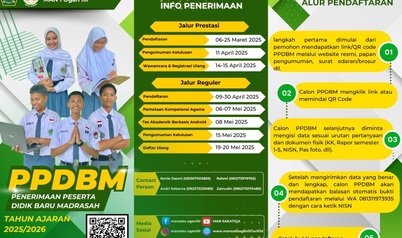 “Untuk semua persyaratan PPDBM MAN 1 Ogan Ilir dapat juga diakses melalui link yang tersedia. Bagi pendaftar jalur prestasi wajib melampirkan piagam prestasinya saat verifikasi berkas sebagai bukti bahwa peserta yang mendaftar memang benar berprestasi,”ujar Renie Dasmi sebagai ketua panitia pelaksana PPDBM MAN 1 Ogan Ilir.