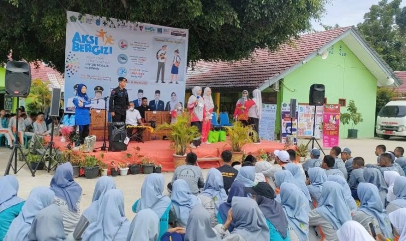 Kepala UPTD Puskesmas cabang Indralaya bersama jajarannya turut menyukseskan Gerakan Nasional Aksi Bergizi yang berlokasi di halaman MAN 1 Ogan Ilir, Rabu (26/10). Pihak puskesmas Indralaya memberikan sosialisasi usai kegiatan Aksi Bergizi terkait pentingnya mengonsumsi makanan dengan gizi seimbang dan minum tablet penambah darah (TTD) bagi remaja putri (rematri).